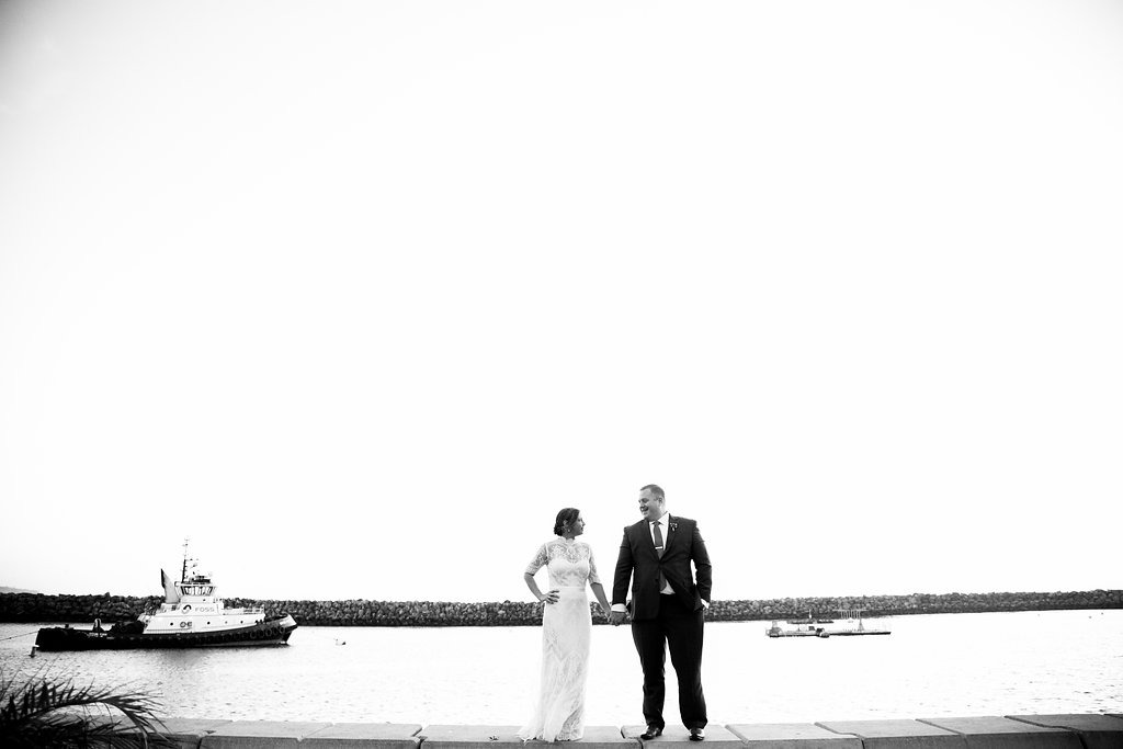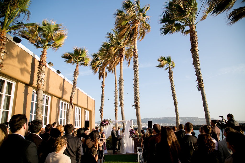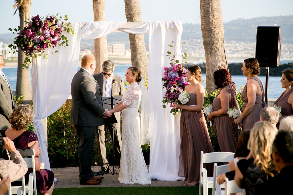 When I first met with Danielle and Jared together, I was struck at how thoughtful and calm they were. They carefully evaluated each decision about their wedding, but didn’t obsess; they listened to their vendors’ advice and trusted all of us, which was so wonderful. (And when she showed me her dress from BHLDN, I was smitten!) I was also excited to work their venue, the Hotel Portofino and Marina, based in Redondo Beach. It was pretty much a beach wedding – we were just a few feet from the water! In fact, as the couple were getting their photos taken (by the awesome photographer Brady Puryear), a boat passed by in the nearby inlet and the passengers hooted and waved in congratulations.