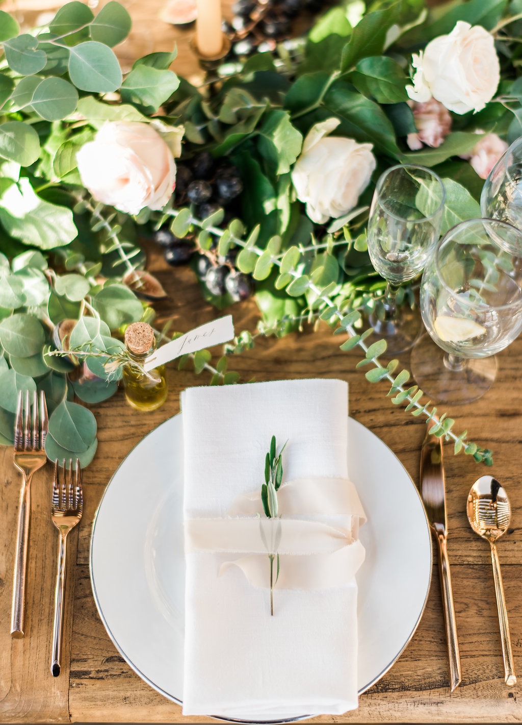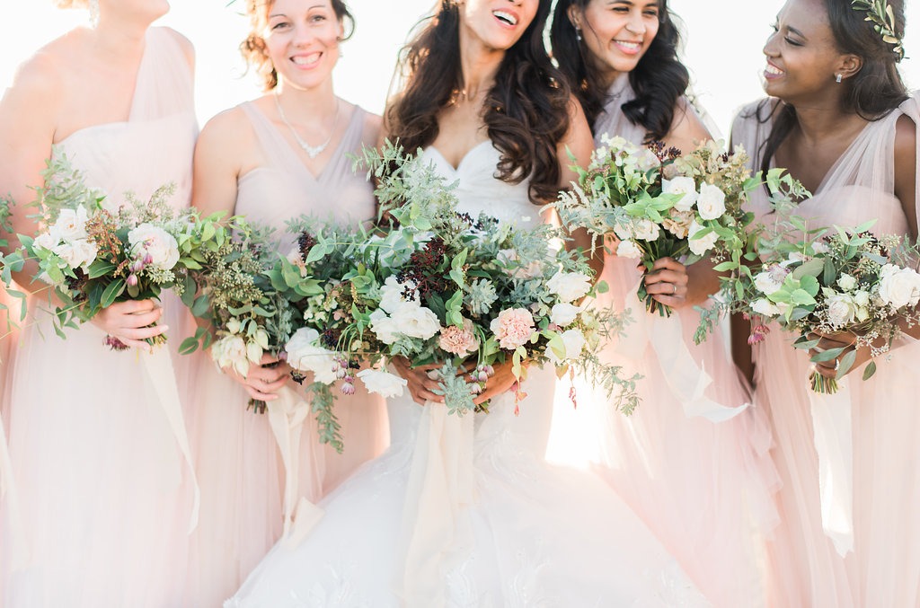 The florist, Plenty of Petals, nailed the romantic, vineyard-inspired florals, Signature Party Rentals provided the chairs and tables, napkins were by La Tavola, and Bright rentals provided the rose gold silverware. Other vendors included Vox DJs, Jacob Jurado (officiant), Tim and Co videography, Jamie Cakes, and Silver Service Catering. The vibe was soft blush, rich organic greens, and French country furniture with rich wood texture.